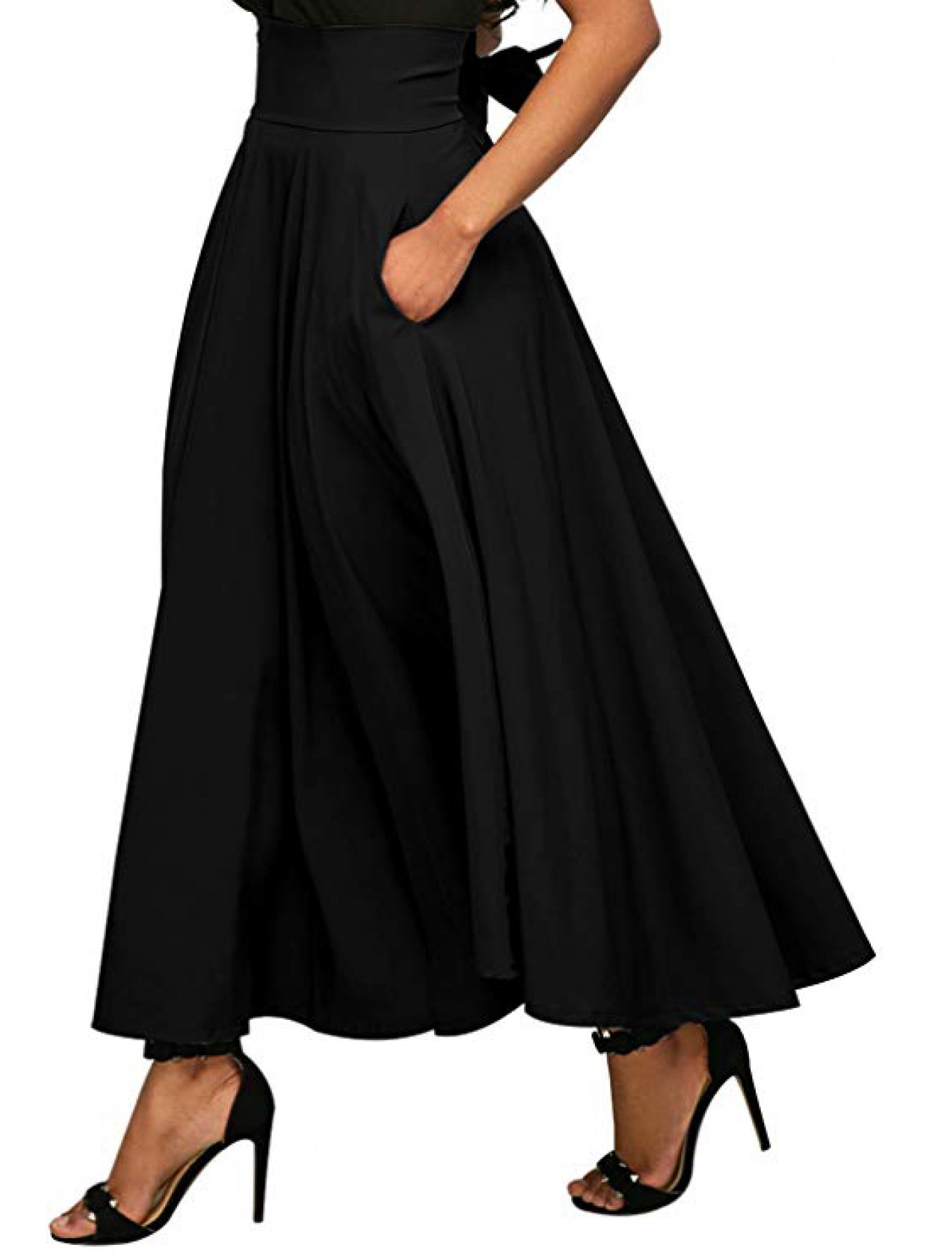 • 2. High waist, tied bow in the back, pockets on the side, two slits in the front, pleated maxi skirt